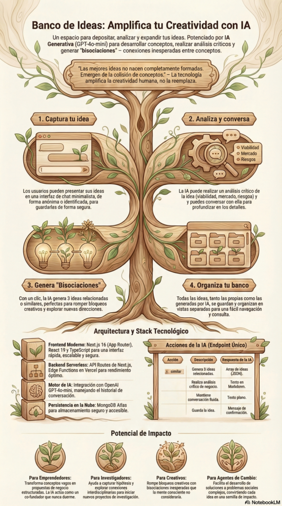 unbancodeideas.com es un espacio diseñado para facilitar la generación y desarrollo de ideas individuales y colectivas. Utiliza tecnologías avanzadas de inteligencia artificial para asistir a los usuarios en la creación, co-creación, refinamiento, expansión y colectivización de las Ideas.